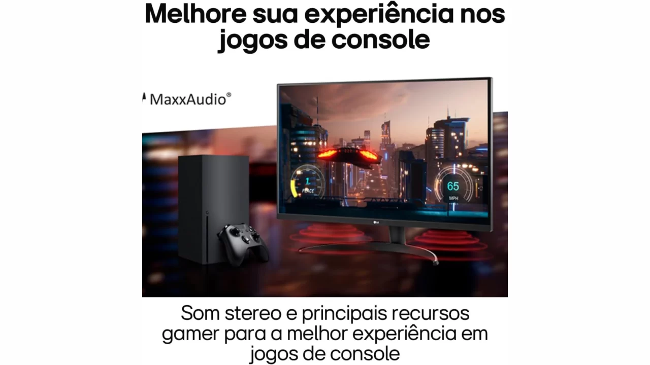 Um dos grandes diferenciais do LG 32UR500-B é o som. Com dois alto-falantes de 5W cada, ele entrega um pico de volume significativo e mantém a qualidade do áudio com pouco ruído. Isso é possível graças à tecnologia MaxxAudio, que melhora a performance sonora do monitor. Para quem não está disposto a investir em caixas de som externas, essa é uma vantagem considerável.